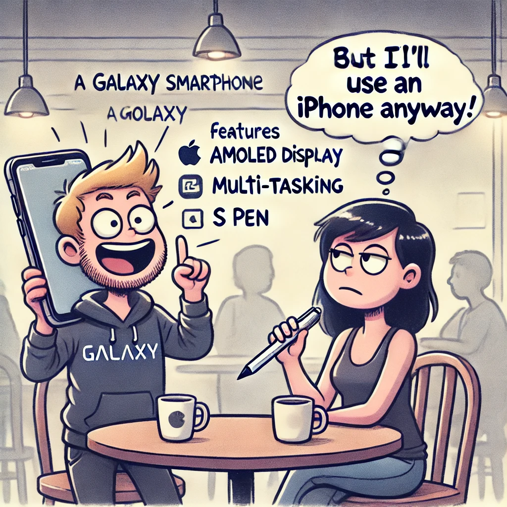 갤럭시는 그야말로 스마트폰의 혁신이다.화려한 AMOLED 디스플레이, 높은 주사율, 강력한 멀티태스킹 성능, 그리고 유연한 커스터마이징 옵션까지.게다가 S펜으로 메모를 작성하고, Dex 모드로 PC처럼 활용할 수도 있다.배터리도 오래가고, 충전 속도는 아이폰이 따라올 수 없을 정도로 빠르다.카메라? 밤에도 별처럼 빛나는 야간 사진 모드, 100배 줌으로 달의 크레이터까지 포착.무엇보다 USB-C 덕분에 충전기도 공유가 가능하다.... 그냥 아이폰 써야지.